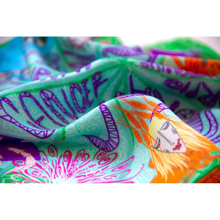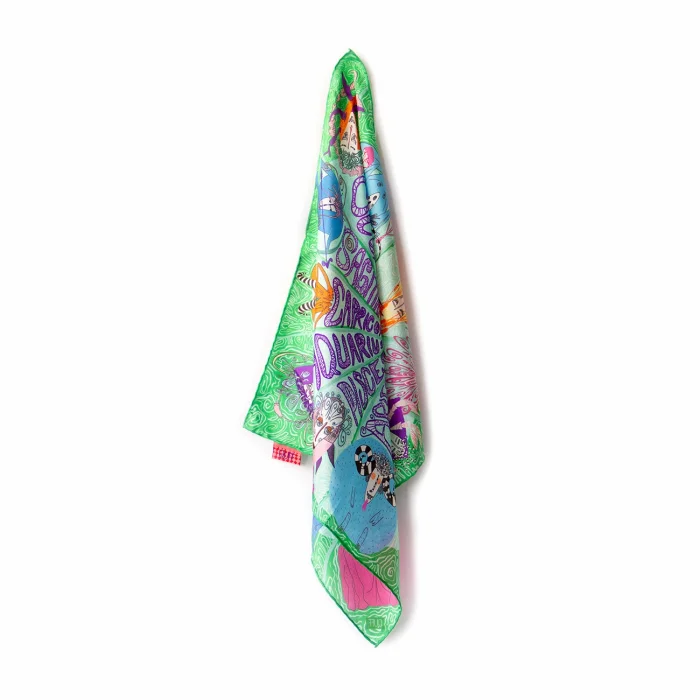 Color : Green Fabric : 100% Vegan Silk Size: 45x45cm Summer is fresh silk. Its edges are sewn by hand. The patterns are hand-drawn and digitally colored. Shipped in special boxes. Only dry cleaning is recommended. Limited edition.