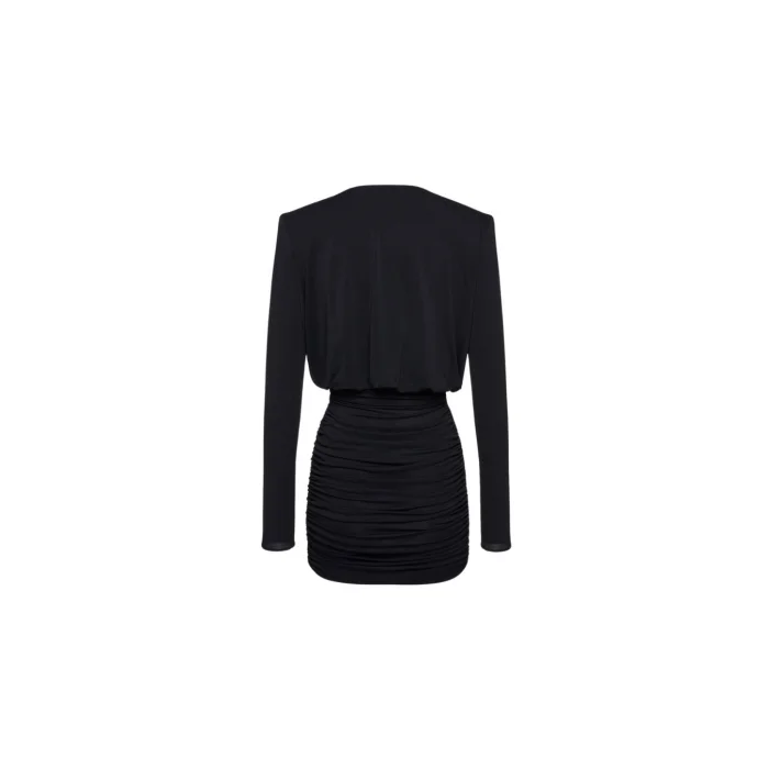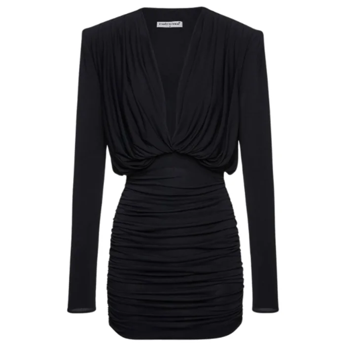 Deep V décolleté, wide, shoulder draping. Mini dress with drape skirt