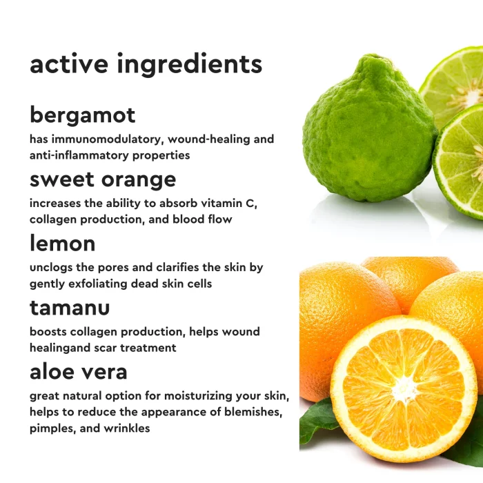Vitamin C-rich organic essential oils such as sweet orange, bergamot and lemon in its content contribute to the elimination of acne problems. Tamanu and aloe vera gel components help maintain pH balance without drying the skin. Sweet orange in aromatherapy is used to relax your soul with natural citrus aromas that soothe stress and tension and increase the feeling of happiness.