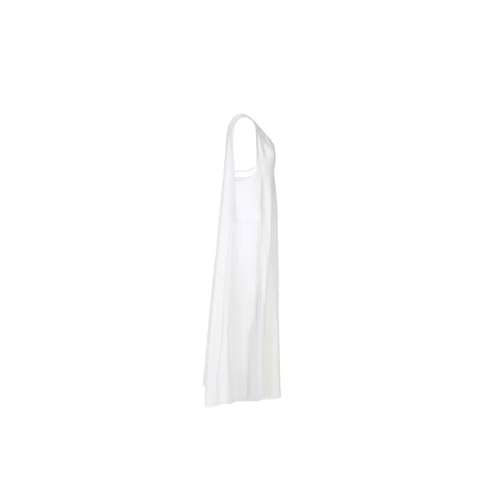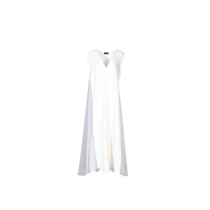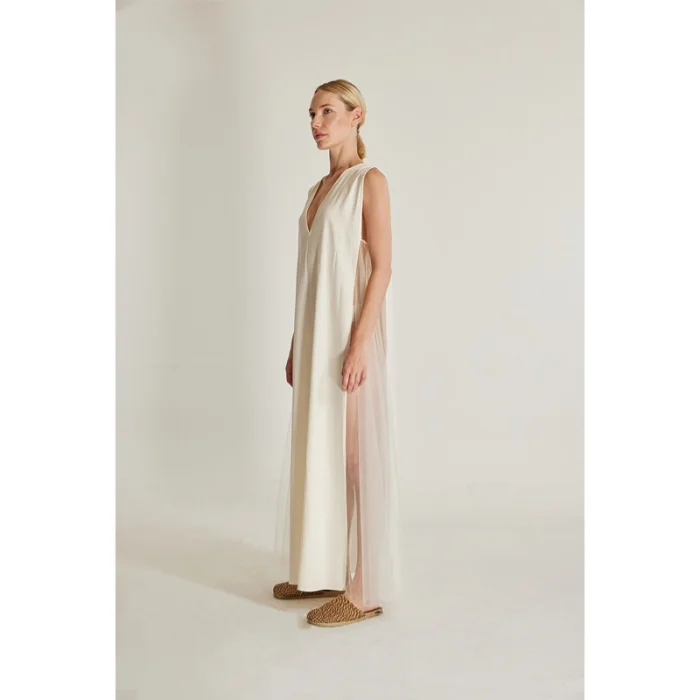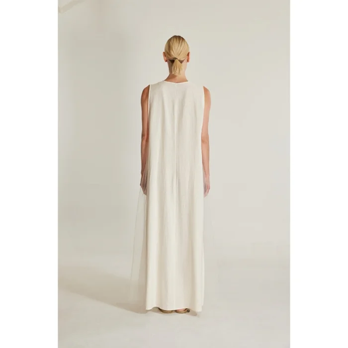 The Mirage Dress is a stunning piece with a long and relaxed silhouette, featuring a deep V-neckline. This dress showcases a combination of linen fabric and sheer panels, adding a touch of allure. It is perfect for those seeking bold and daring outfit combinations. The Mirage Dress effortlessly combines style and comfort, allowing you to feel confident and make a statement wherever you go.