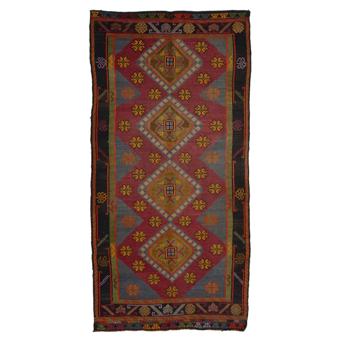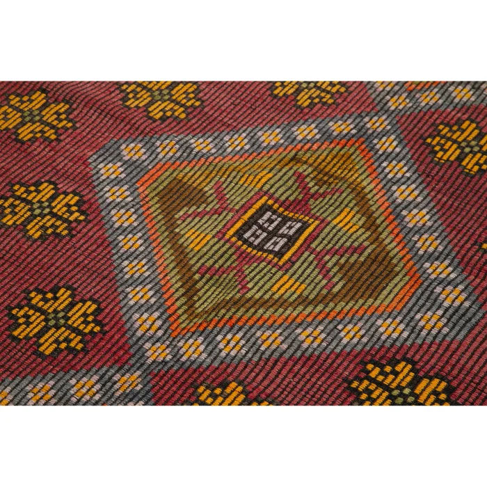 Vintage Cecim kilims are on 163 cm width and 325 cm length and the pile height is 5mm, the approximate weight of the rug is 11 kg. It’s % 100 handknotted wool and goat hair rug. It’s made from the natural dye.
