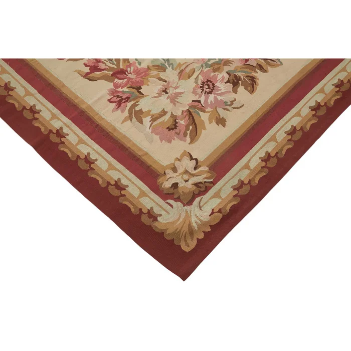 The Aubusson Kilim is 265 cm wide by 370 cm long and about 5 mm thick. It weighs an average of 11 kg. It is made with hand-spun wool and cotton. It takes its colors from root dyes obtained naturally.