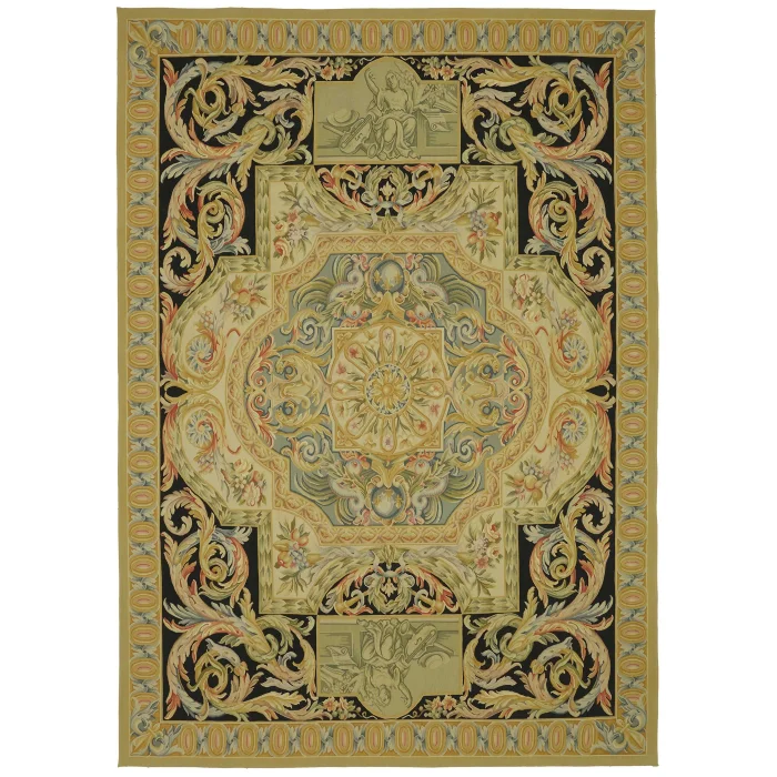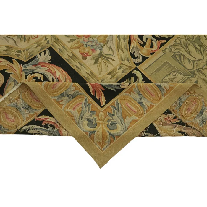 The Aubusson Kilim is 268 cm wide by 380 cm long and about 5 mm thick. It weighs an average of 11 kg. It is made with hand-spun wool and cotton. It takes its colors from root dyes obtained naturally.