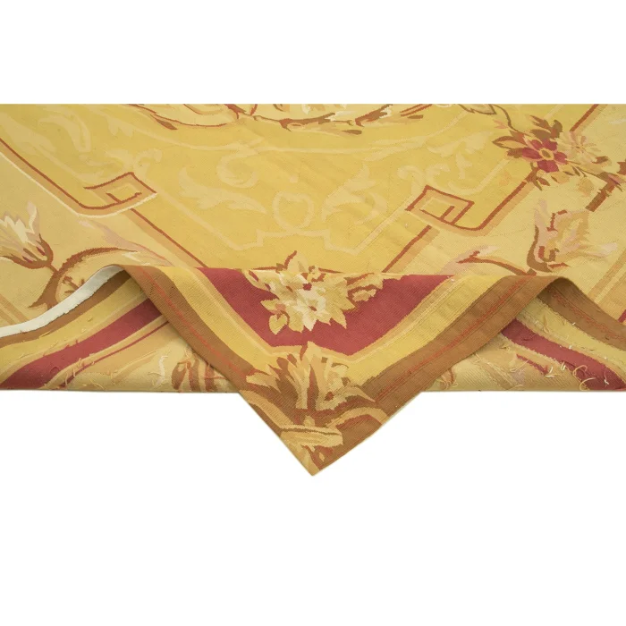 The Aubusson Rug is 264 cm wide by 363 cm long and about 5 mm thick. It weighs an average of 11 kg. It is made with hand-spun wool and cotton. It takes its colors from root dyes obtained naturally.
