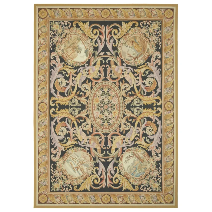 The Aubusson Rug is 296 cm wide by 426 cm long and about 5 mm thick. It weighs an average of 14 kg. It is made with hand-spun wool and cotton. It takes its colors from root dyes obtained naturally.