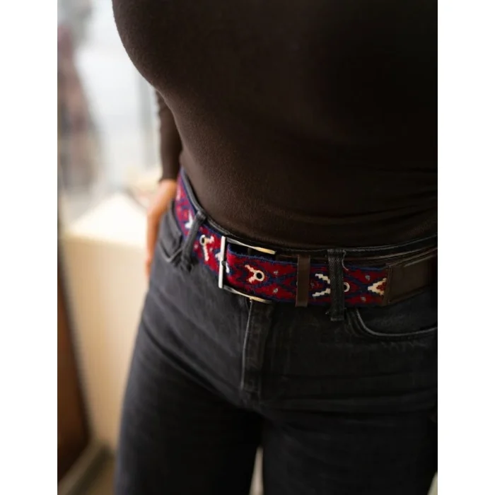 Inspired by the ancient Anatolian–Persian weaving tradition, this unique belt is crafted from handwoven kilim and features protective Eye and Crown motifs. The eye motif symbolizes protection and intention, while the crown motif represents strength, honor, and self-worth.