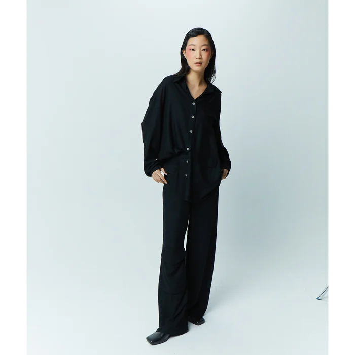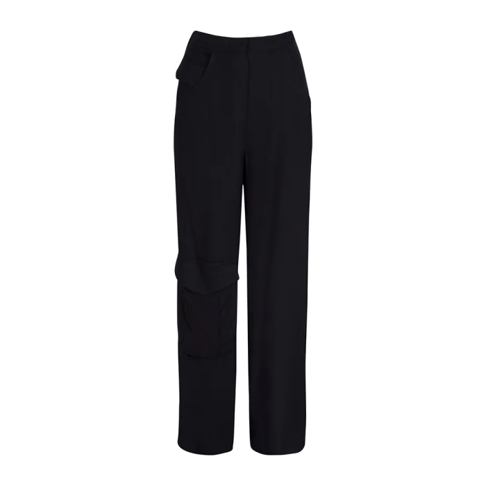 It has a sophisticated look with its soft fabric texture. A gusseted pocket is used below the knee.