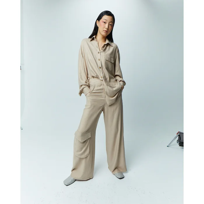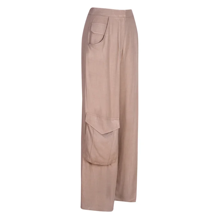 It has a sophisticated look with its soft fabric texture. A gusseted pocket is used below the knee.