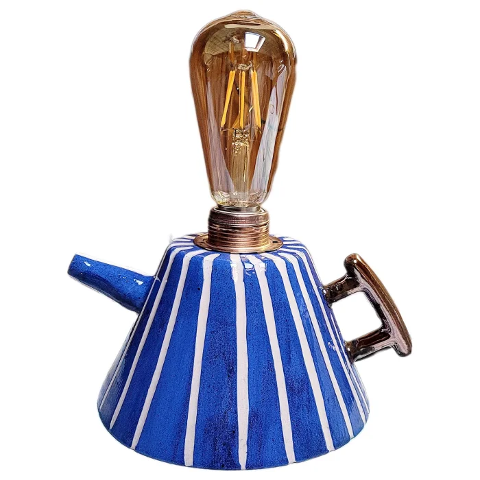 Teapot form, blue, striped, completely handmade and hand-painted, ceramic lighting, decorative table, bedside lamp, decorative lighting object.