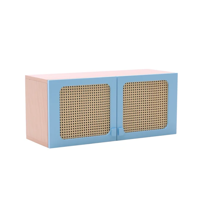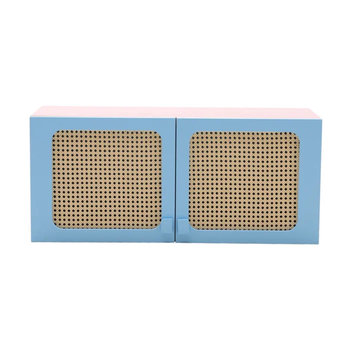 It is a bookcase with two covers. Rattan details are used on the covers.
