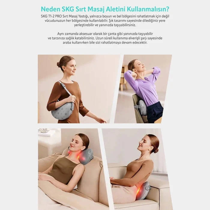 SKG T1-2 PRO Massage Pillow: Special Thermotherapy-Heat Therapy, Waist, Buttock, Back, Shoulder Neck Massager, Portable, Suitable for Outdoor Use, Wireless and Type-C Charging Support The SKG T1-2 PRO Massage Pillow is the perfect solution to relieve the stress and fatigue that comes with modern life. This device provides relaxation to various parts of your body with special thermotherapy and deep tissue massage features. This massage pillow, which is effective in areas such as waist, hips, back, shoulders and neck, can be used anywhere with its portable structure and wireless use. Thanks to its Type-C charging support, it can be charged quickly and offers long-term use. Important Features 1. Sleek and Compact Design: Thanks to its modern and compact design, it can be easily transported and used anywhere. 2. Deep Kneading, Full Body Massage: With its deep kneading feature, it provides a full body massage and relaxes the muscles. 3. Relaxing the Body with Large Space Heating: The large heating area offers in-depth heat therapy to various parts of the body. 4. Powerful & Ultra-Quiet: Thanks to its powerful copper motor, it works ultra-quietly while offering effective massage. 5. 4D Shiatsu Neck and Back Massager: It provides an experience close to the human touch with 3 different massage techniques. 6. Suitable for Indoor and Outdoor Use: Thanks to its portable structure and wireless use, it can be used both at home and outdoors. 7. Thermotherapy & Heat Therapy: Offers heat therapy in the temperature range of 38°C to 42°C. 8. Multifunctional Use: It can be applied to different parts of the body, such as waist, neck, back, buttocks and legs. 9. Ergonomic and User-Friendly: With its ergonomic design, it provides a comfortable use and adapts to the natural curves of the body. 10. Type-C Charging Support: It can be charged quickly and offers long-term use. Q&A 1. In which areas can this massage pillow be used? This massage pillow can be used on various parts of the body, such as waist, buttocks, back, shoulders, neck and legs. 2. How quietly does the massage pillow work? The SKG T1-2 PRO Massage Pillow offers ultra-quiet performance with a sound level of just 50dB. 3. How does heat therapy work? The massage pillow offers heat therapy in the temperature range of 100.4°F to 107.6°F (38°C to 42°C), relaxing the muscles and providing relaxation. 4. How can I charge this massage pillow? With the Type-C charging cable, you can charge it quickly and easily. 5. Is the massage pillow portable? Yes, thanks to its sleek and compact design, it can be easily transported and used anywhere. 6. What massage techniques does it offer? 4D Shiatsu massage offers a variety of massage techniques, such as deep kneading and large area heating. 7. How long can the massage pillow be used? It provides long-term use with a full charge. Charging time and usage time depend on the specifications of the product. 8. Is the massage pillow water resistant? This product is not water resistant, so contact with water should be avoided. 9. What color options are available? The product is usually presented in gray. Other color options are not available. 10. How is the material quality of the massage pillow? It is made with high-quality plastic and ergonomic design, which ensures long-lasting use. Technical Specifications Dimensions: 35cm x 20cm x 10cm Color: Grey Material: High quality plastic Charging Type: Type-C fast charging Heat Therapy Temperature: 38°C - 42°C Sound Level: 50dB Massage Techniques: 4D Shiatsu, deep kneading, large area heating Uses: Waist, hips, back, shoulders, neck, legs Portability: Wireless use, suitable for outdoor use Warranty: 2 years Experience professional massage from the comfort of your own home with the SKG T1-2 PRO Massage Pillow. Relax your muscles, relieve stress and relieve the tiredness of the day with thermotherapy and heat therapy features. This massage pillow, which you can easily use both indoors and outdoors, will be indispensable with its portable structure and easy-to-charge features.
