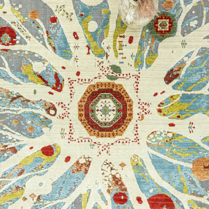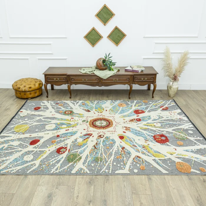 with abstract designThe specially designed modern carpet model is produced by experienced craftsmen in the Aegean region with the black loom weaving technique. This production method gives the carpet both a modern and abstract character.