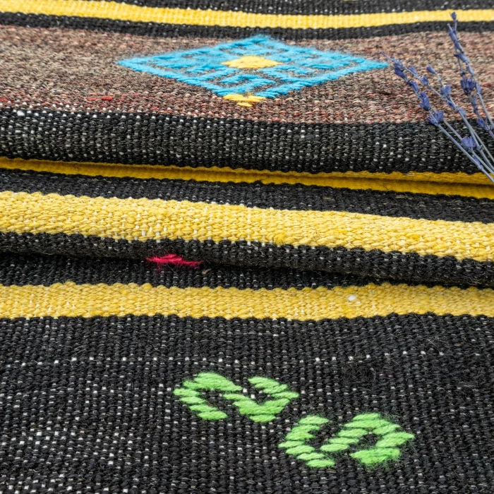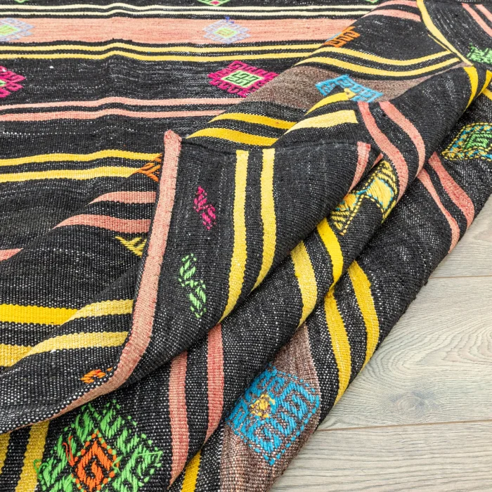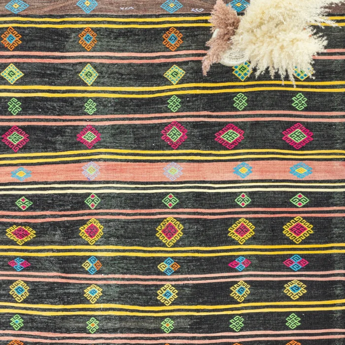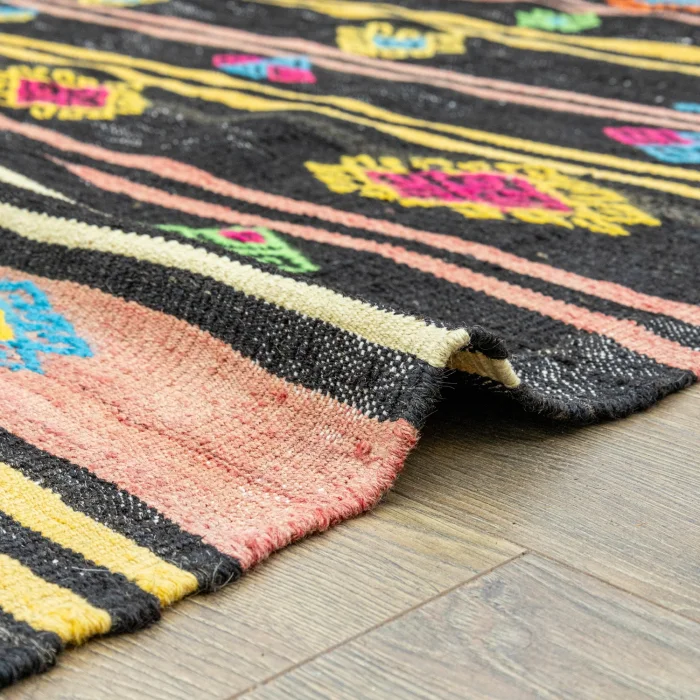 We are here with Soho Antiq traditional and modern rug models that will make a difference to your life! Specially designed to adapt to any space, this rug model is produced using unique handloom techniques and consists entirely of natural wool and goat hair. This is just one of its many features that make it special. The base color of the rug model is black, and the other side colors are pink and multicolored. Thanks to these harmonious colors, you meet with an aesthetic rug. This rug is prepared with the twine weaving technique. In the twine weaving technique, there are reliefs as if embroidered with a needle. The dimensions of the rug are 256 x 390 cm, and the thickness is approximately 1-3 cm. With Soho Antiq, you can experience traditional touches. The design of this carpet was inspired by the Anatolian region and especially has the aesthetic features of the 1970s. Hand-woven carpet and rug models can cause wear over time. However, contrary to popular belief, this makes carpets and rugs look better quality. Worn, handwoven carpets and rugs are long-lasting and increase in value as time goes on. In addition, hand-woven carpets and rugs, which change their appearance, can add difference to the environment they are in! Hand-woven custom rugs produced with Soho Antiq quality are an ideal choice for those who love naturalness and originality. If you want to add a special touch to your home, you can choose one of our hand-woven rugs.