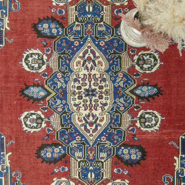 Soho Antiq hand-woven carpets and rugs are designed to breathe into your living spaces. This exquisite hand-woven rug is created by expertly combining carefully selected high-quality wool yarns. Produced using traditional handloom techniques, the carpet is specially designed to add warmth and elegance to your home. The color palette is inspired by the soft tones of nature, and while it draws attention with the harmony of blue, gray and red colors, it catches harmony with other colors in the carpet. The carpet was carefully woven by experienced handicraftsmen and produced in the 1970s with traditional techniques unique to the Anatolian region, which adds a cultural depth to the carpet. The size of the carpet is measured as 200x307 cm, and this size allows the carpet to easily adapt to different living spaces. The thickness of the carpet is between 1 - 3 cm. Beyond its aesthetic value, this hand-woven rug stands out when it comes to adding authenticity and a traditional feel to your home.