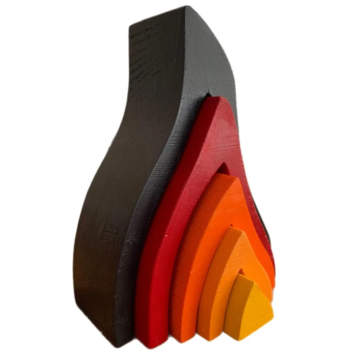 The 5-flame, completely handmade, is crafted from beechwood. The flame, painted child-safely, features yellow, melon, orange, red, and dark brown. It encourages children to use their imaginations and play.