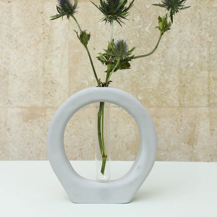 Ring Vase has a smooth and a matte surface and is manufactured using our special water resistant concrete mixture. The tubes shown in the images come with the vase while the flowers do not. Our products are completely handcrafted by Studio Ays. If your product gets stained, clean it as soon as possible using a damp cloth. If left untreated for too long, stains may remain on the product. Our products are not suitable for washing in the dishwasher. Please avoid harsh scrubbing and chemical products when cleaning.