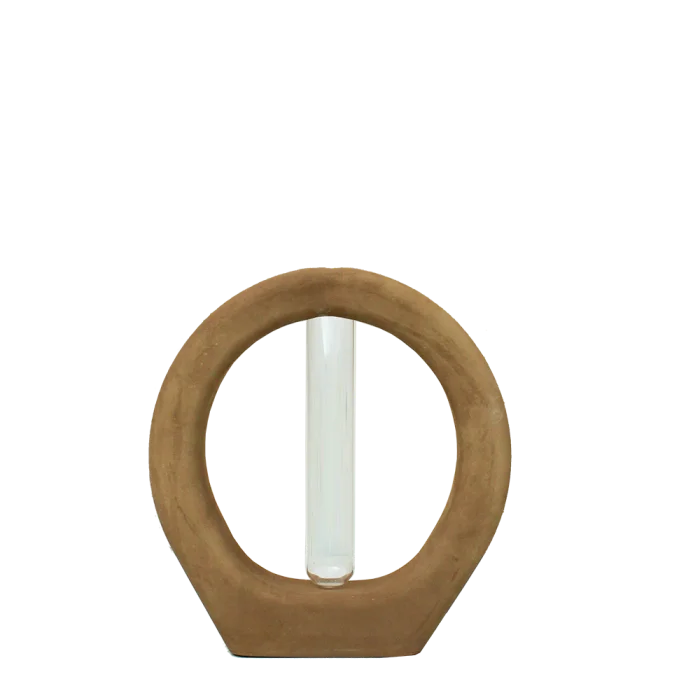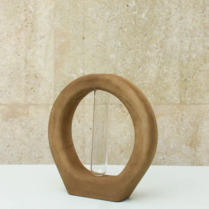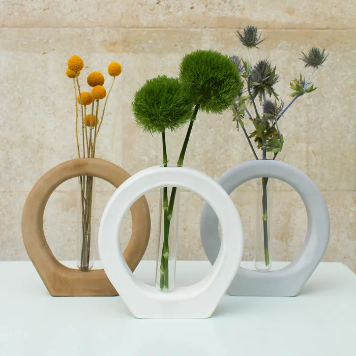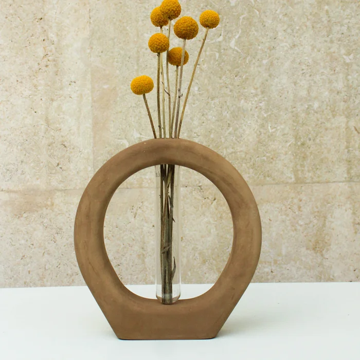 Ring Vase has a smooth and a matte surface and is manufactured using our special water resistant concrete mixture. The tubes shown in the images come with the vase while the flowers do not. Our products are completely handcrafted by Studio Ays. If your product gets stained, clean it as soon as possible using a damp cloth. If left untreated for too long, stains may remain on the product. Our products are not suitable for washing in the dishwasher. Please avoid harsh scrubbing and chemical products when cleaning.