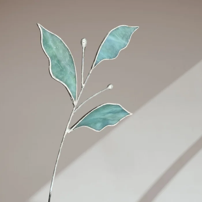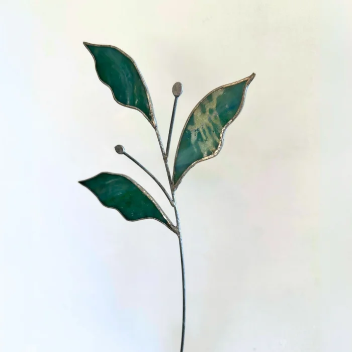 Zümrüt brings the balanced beauty of nature to life through its large green leaves and delicate budding details. Each element is carefully handcrafted from stained glass and joined with a slender soldered metal stem.