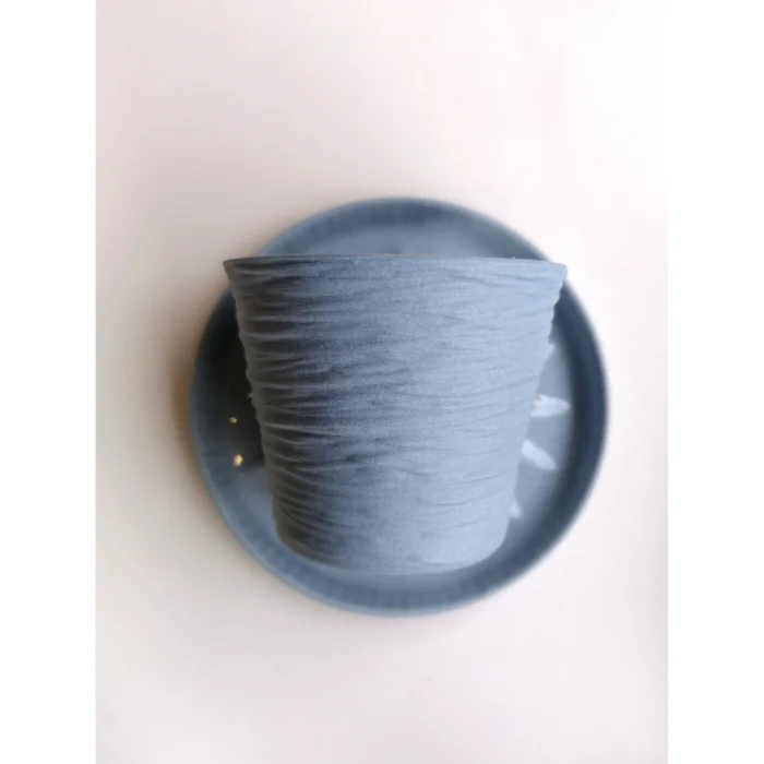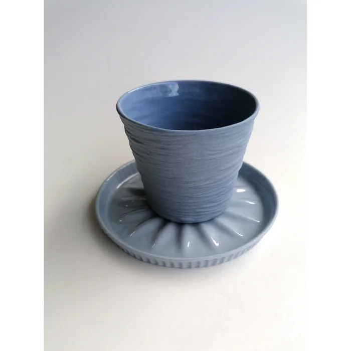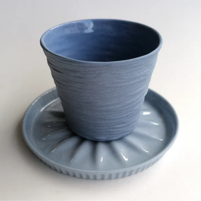 It's handmade fine porcelain. The inner surface of the glass is colored glaze and the outside is unglazed. Each product is hand drawn.