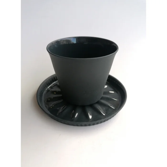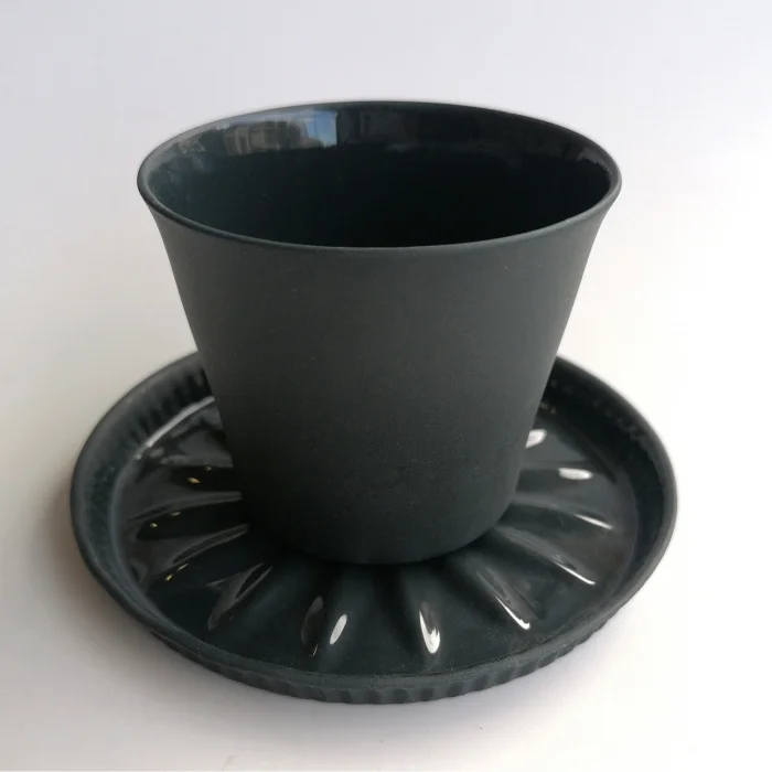It's handmade fine porcelain. The inner surface of the glass is colored glaze and the outside is unglazed. Each product is hand drawn.