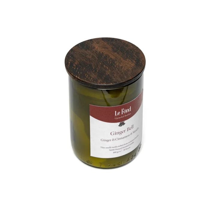 This product is obtained by recycling waste bottles collected from Istanbul's restaurants and wine bars. All bottles are hand-cut, sandblasted and polished. It is hand-cast in Istanbul using 100% natural wax and first-class fragrance essences. The sustainable and eco-friendly wooden lid prevents the candle from getting dusty and retains the smell when you are not using it. Ginger Bell: Dominant Notes: Ginger, Cinnamon, Vanilla Height: 11 cm Diameter: 7 cm Weight: 300 gr Burning Time: Approximately 50 hours Effect Area: Fragrance performance up to 30 m2