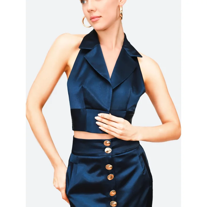 Gold button-detailed cropped vest & pocketed maxi skirt. Made from 100% polyester, crepe satin fabric. The vest and skirt feature gold button details. The outfit worn by the model is size S. The product is available in the desired color and size.