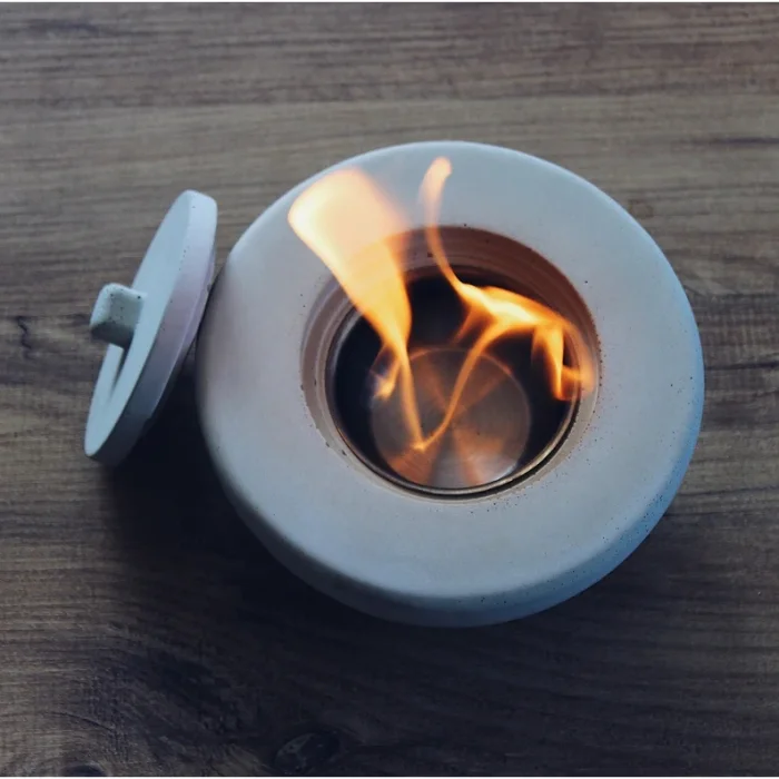. Apart from a single purpose of use such as heating, its features such as its mystical effect in the atmosphere, ease of use and portable places of use attract attention. Since the product is produced with a natural element such as concrete, it accompanies a living cycle. The fireplace, which undertakes aesthetic touches with its durable structure of concrete, is designed to easily adapt to the places of use and to carry natural textures to indoor and outdoor spaces such as homes and offices.