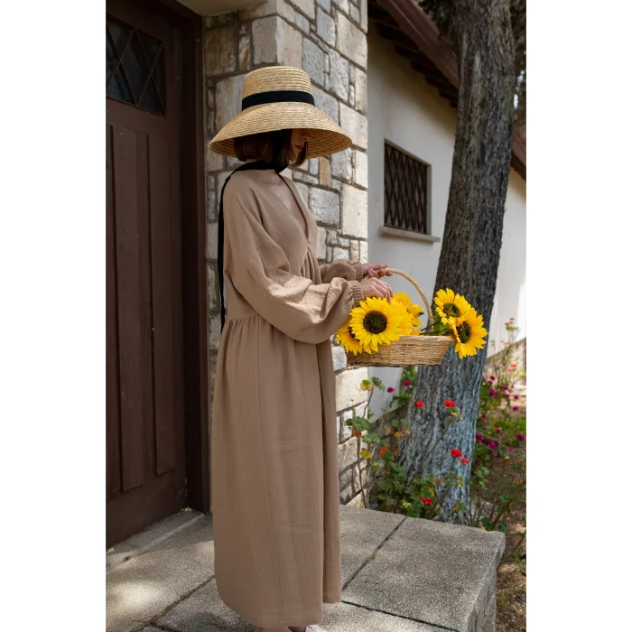 V-neck bohemian dress is balloon sleeve and the ankle part is elastic.