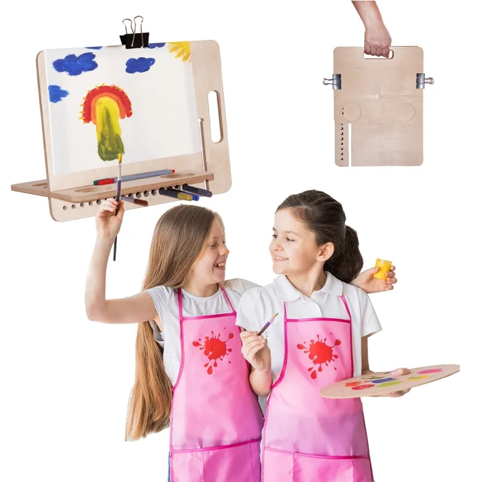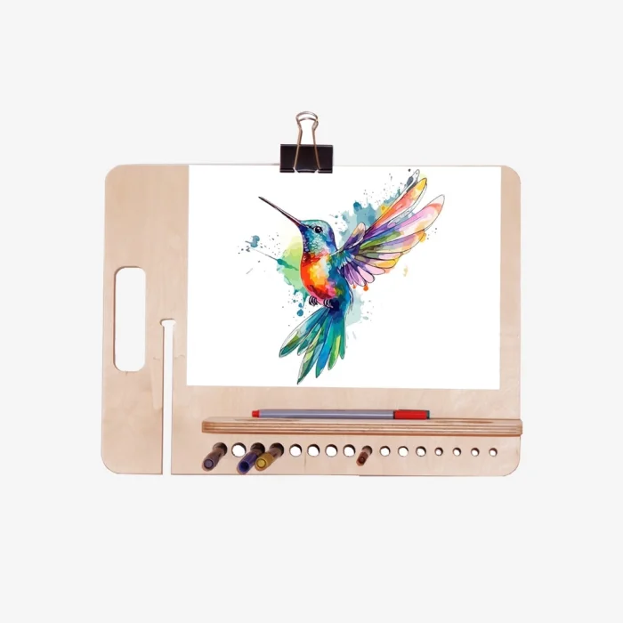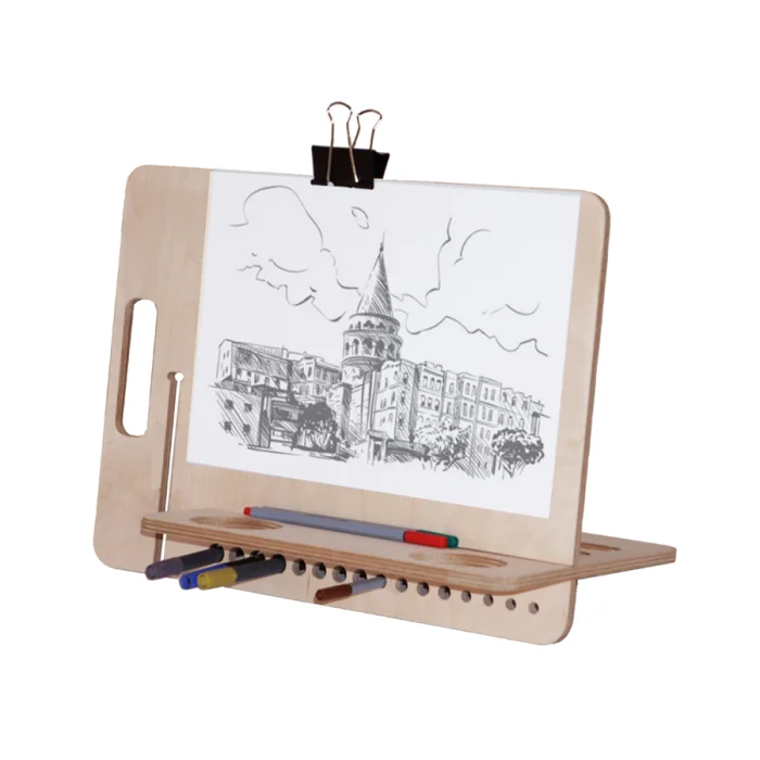 Kikomi Drawing Desk is designed to draw A4 size watercolor and sketch drawings. It can be adjusted horizontally and vertically. You can easily carry the Drawing Stand by turning it into a bag with the help of 2 clamps. The Desktop Drawing Easel has spaces for your pens and brushes at the side section. There is space also for the water of watercolor. The product consists of 2 wooden parts. Clamps are not included in the product.
