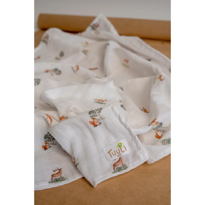 Muslin set made of 100% organic cotton, GOTS certified, with anti-allergic fabric. It offers comfort and elegance to your baby with its specially designed patterned soft pieces.