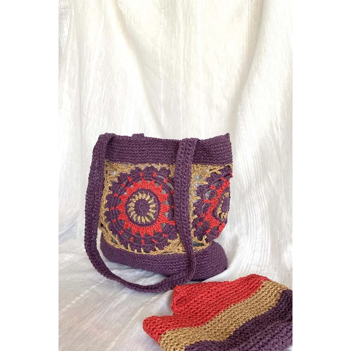 It is a 100% handmade shoulder bag. It is a very sturdy bag due to its knitting technique and yarn feature. It provides an aesthetic and original appearance with its color combination and form.