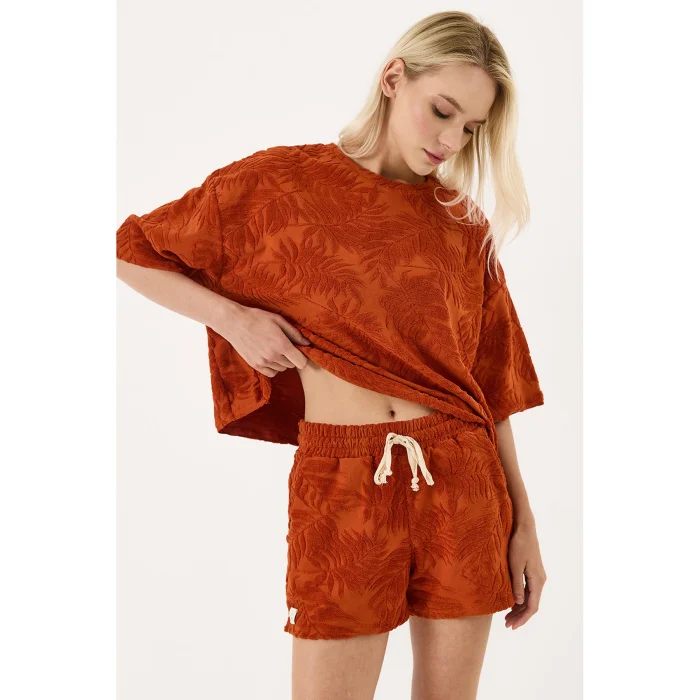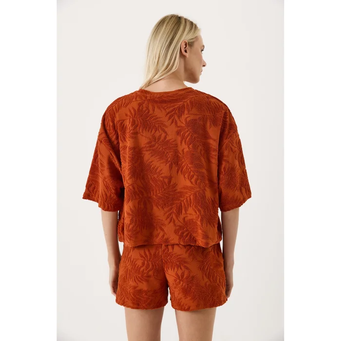 The oversize fit and low shoulder cut provide a modern look without restricting body movements. With four color options, each model has its own character: the sun in the beige model, the cactus in green, the leaf embroidery in khaki, and the patterned leaf texture in orange. It can be comfortably combined with team shorts or alone.