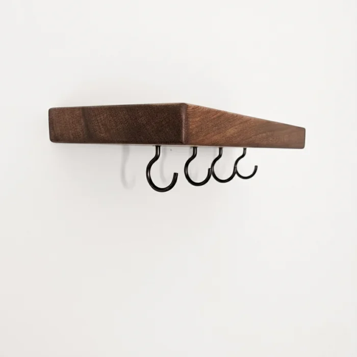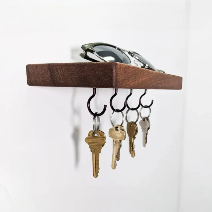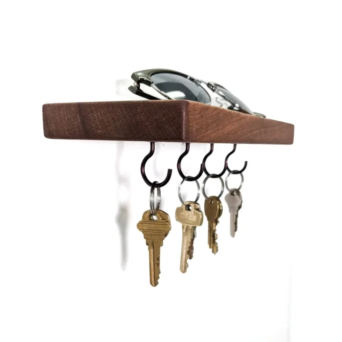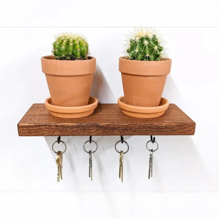 The handmade wooden shelf hook keychain is designed to beautify the entrance of your home with both its functionality and aesthetic appearance. Made of high-quality natural wood, this keychain adapts to any home with different width options. The shelf at the top offers extra space to put your wallet, glasses or decorative items. Sturdy hooks on the bottom help keep your keys organized and always within reach. It is made of solid beech wood and finished with natural oil. Our products are handcrafted by local artisans. Since it is made of solid wood, slight differences such as knots and color tones can be observed. Product Dimensions: Depth: 12 cm Width: 25 cm Width: Medium: 38 cm Width: Large: 50 cm Width: 60 cm