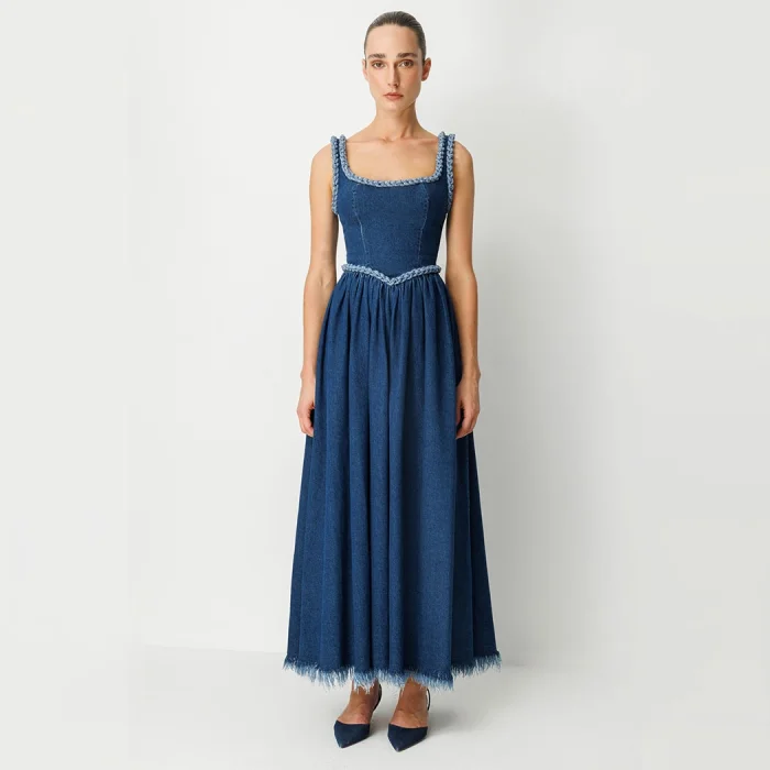 Luce Del Sole Collection: Modern Denim Dress with a Vintage Touch. This special piece combines elegance and style by modernizing the denim fabric with vintage touches. Handmade knitted embellishments on the neckline add an eye-catching accent to the deep square neckline and body. The bodice cut provides a striking look at the waist, enhancing the elegance of the dress. This Dress Stands Out As One Of The Signature Pieces Of The Luce Del Sole Collection. . Features:. - Collar Detail: Handmade, elegant knitted embellishments. - Back Closure: Eyelet closure for a stylish and comfortable fit. - Style: The pleated design offers freedom of movement and a feminine silhouette. - Material: 100% cotton denim fabric. - Production: Carefully produced in Turkey. . This dress blends classic vintage style with modern touches, making it a must-have addition to any wardrobe.