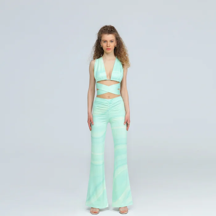 Bell bottomed trousers with high waist , deep V low-necked , drape detail on waist