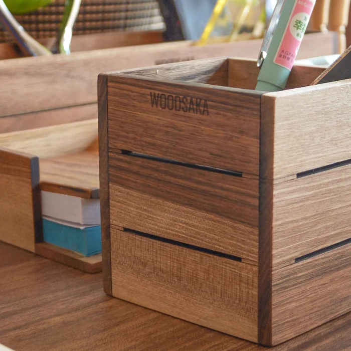 Woodsaka 3Line Office Set - Walnut Wood Pen Holder - Paper Clip Holder - Business Card Holder - Note Paper Box