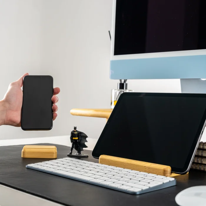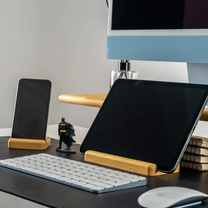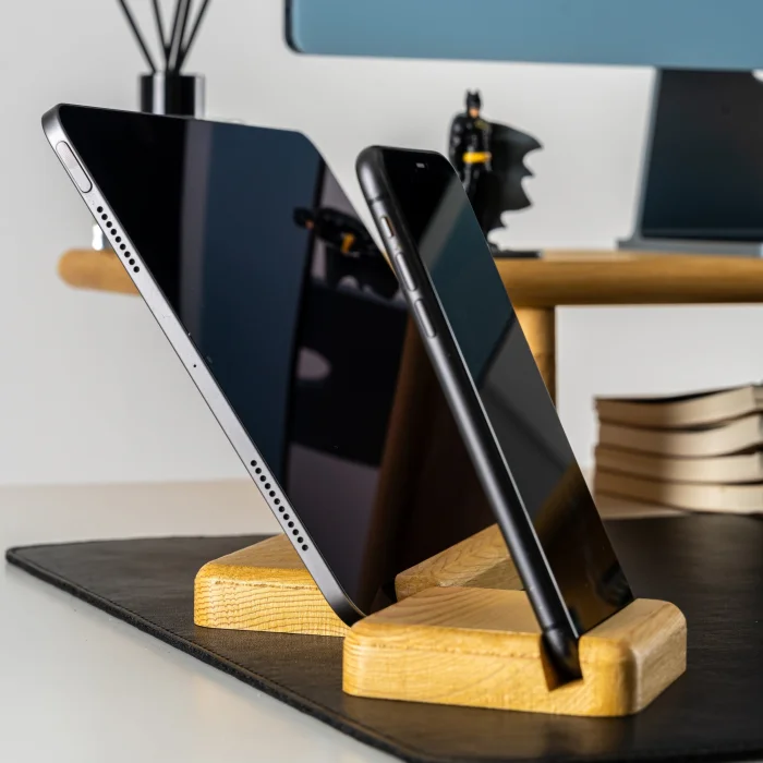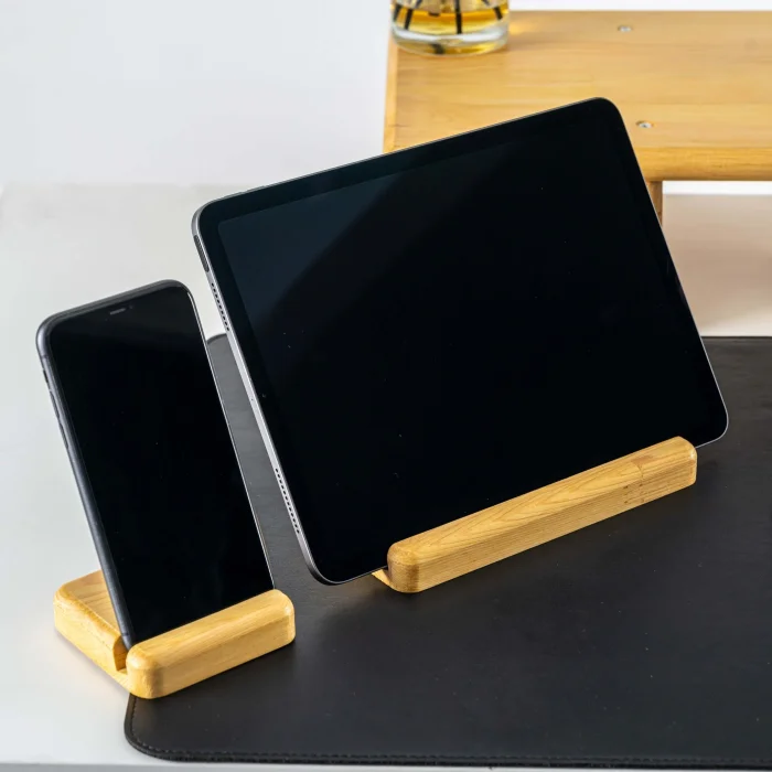 Space for Phone and Tablet:1.1cm • Tablet Holder Product Dimensions: 18x8x1.8cm • Length: 18cm • Width: 8cm • Height: 1.8cm • Phone Holder Product Dimensions: 8x8x1.8cm • Length: 8cm • Width: 8cm • Height: 1.8cm It offers a wide base that is compatible with different tablet models. It offers a safe and stylish support when using or charging your phone and tablet. The stand, which can hold your phone vertically or horizontally, provides practicality when watching videos, making video calls, or organizing your desktop. Enjoy using your tablet while watching videos, reading books, or working. All of our products are produced in our wood workshops in Izmir. Since it is produced entirely from natural wood, there may be color and pattern differences between the products. The product is made of pine wood, water-based varnish is used, which is harmless to health. You can use it for a long time with peace of mind. The varnish made to protect the products is handcrafted by our certified teachers in the art workshop.