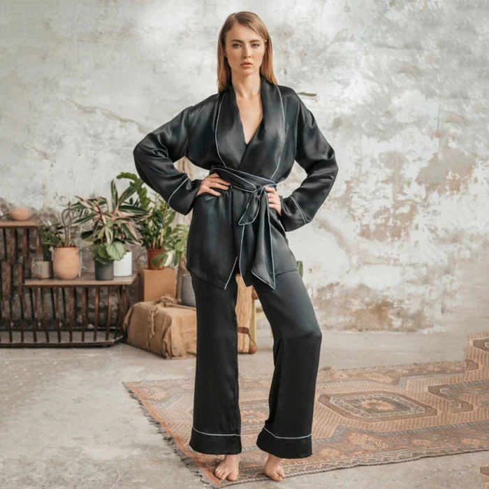 The Elegant Collection series is designed with pure materials. It is a product of top quality materials and design.Silk pajama set is delivered in a special cover. Dry cleaning or hand washing with cold water is recommended.