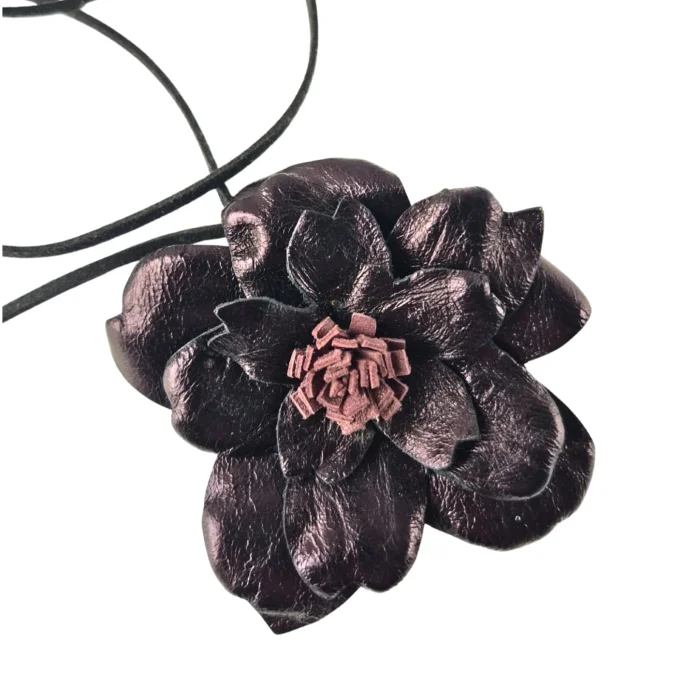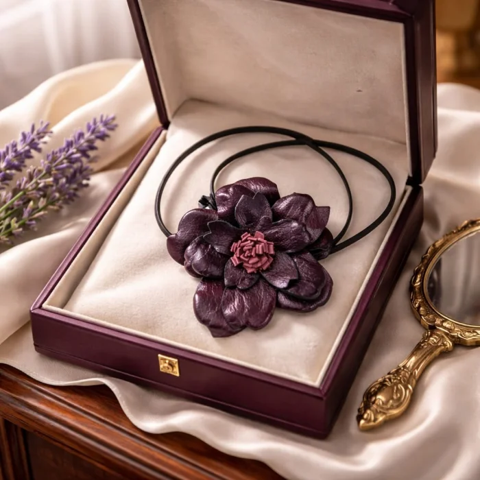 handmade design, women's labor, genuine leather, natural material, timeless elegance, romantic touch, sustainable design, limited edition, special gift, leather choker, flower necklace, romantic jewelry, elegant design