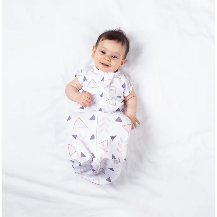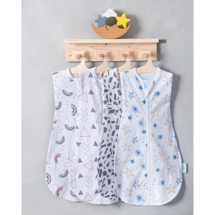 The Baby Swaddle Sleeping Bag is worth 0.3 Tog. It is made of organic cotton and is GOTS certified. With its two-way zipper and sleeve snaps, you can swaddle your baby in seconds. If you wish, you can also use it with the arms open. It is in the form of a swaddle in accordance with your baby's position in the mother's womb, it wraps your baby's chest; It calms and reassures. It reduces sudden startles due to the Moro reflex, which is seen especially in the first months and causes babies to wake up frequently.0,3 Tog sleeping bag at room temperature of 21-24 degrees with a long-sleeved bodysuit and bottom pajamas/trousers; with a half-sleeved or sleeveless bodysuit at room temperature of 24-26 degrees; You can wear a sleeveless bodysuit at room temperature of 26 degrees. It does not restrict your baby's movements with its fabric that stretches on both sides. With its pouch-shaped design, it prevents hip dislocation and allows the legs to move freely. Thanks to its natural fabric, it keeps the baby's body temperature constant at room temperature compatible with the tog value and prevents it from getting cold. It offers your baby a safe and comfortable sleep without a blanket. With its two-way zipper, you can check the diaper and change the diaper without waking your baby. Zipper guards are designed so that the zipper start and end points do not hurt your baby's skin. Arm snaps do not contain nickel. Thanks to its snap fasteners that can be opened and closed, it facilitates the transition from swaddle to sleeping bag. There is an extra layer of cotton snap protection that prevents the snaps from touching your baby's skin. Since the sleeping bag needs to sit and wrap around your baby, we recommend that you buy the product that is suitable for your own size. The product size chart is as follows; Body Measurements: 0-3 months shoulder to foot Product length: 59 cm - Bust: 22 cm Weight: 2.5-6 Kg 3-6 months shoulder to foot Product length: 64 cm - Bust: 23 cm Weight: 6-9 Kg 6-12 months Shoulder to foot Product length: 74 cm - Bust: 25 cm Weight: 9-12 Kg Content: 95% Organic Cotton 5% Ellastene Produced in Turkey. Since the product is produced from organic cotton yarn with natural ingredients, color changes can be seen due to washing and use. (Washing with fabric softener, using baby oil, washing at high temperature, etc.