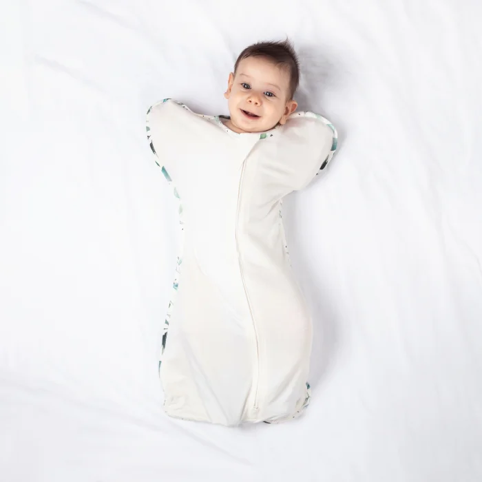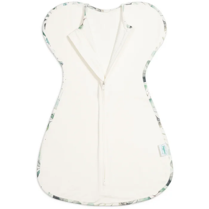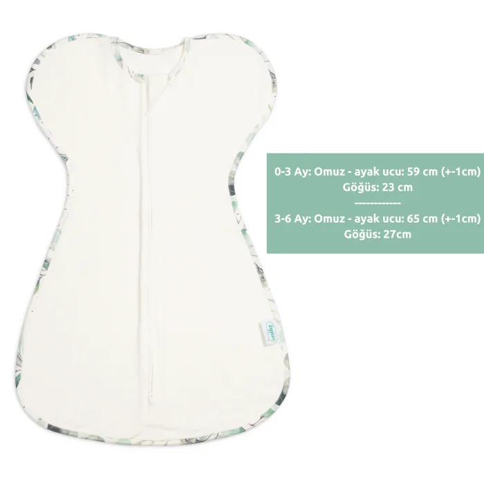 Organic Cotton Butterfly Swaddle Sleeping Bag - 1 TOG - Leaf Butterfly-shaped ergonomic design with arms up (swaddle up), suitable for the position of the baby in the mother's womb; It reduces the effects of startles due to the Moro reflex. Wraps around your baby's chest; It calms and reassures. GOTS certified organic cotton fabric; It does not contain any chemicals. You can swaddle your baby in seconds. The two-way zipper, which opens from both the bottom and the top, allows you to easily change diapers. It does not restrict your baby's movements with its fabric that stretches on both sides. With its pouch-shaped design, it prevents hip dislocation and allows the legs to move freely. Thanks to its natural fabric, it keeps the baby's body temperature constant at room temperature, which is compatible with 1 tog, and prevents it from getting cold and sweating. It offers your baby a safe and comfortable sleep without a blanket. Zipper guards are designed so that the zipper start and end points do not hurt your baby's skin. Sleeping Bag Tog Values:1 Tog sleeping bag At room temperature of 20-22 degrees, you can wear your baby in sleeveless pajamas, long-sleeved pajamas and pajamas; At room temperature of 22-24 degrees, with long sleeve bodysuit/upper pajamas and bottom pajamas, At room temperature of 24 degrees, you can only wear it with a half-sleeved bodysuit. The tog value depends on the room temperature, and indicates the heat permeability of the fabric. 0-3 months shoulder to foot Product length: 59 cm – Bust: 23 cm Weight: 3-6 Kg 3-6 months shoulder to foot Product length: 65 cm – Bust: 27 cm Weight: 6-9 Kg We recommend washing at a maximum temperature of 40° with similar colors. You can dry it by hanging it or laying it out. Do not drum dry organic cotton fabrics. Since the product is produced from organic cotton yarn with natural ingredients, color changes can be seen due to washing and use. (Washing with fabric softener, using baby oil, washing at high temperature, etc.) 95% Organic Cotton 5% ElastenProduced in Turkey.