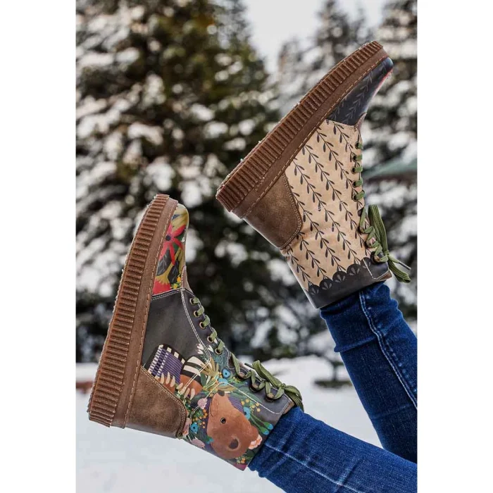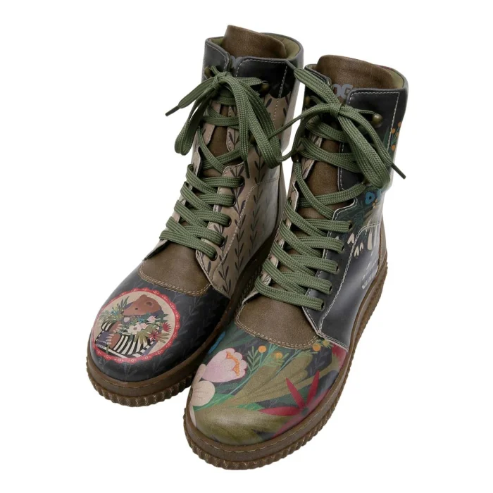 Product: Women Vegan Leather Khaki Long Boots - Bear And Flowers Design